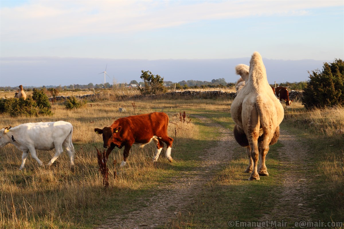 Kamel bereder sig väg bland kalvarna.